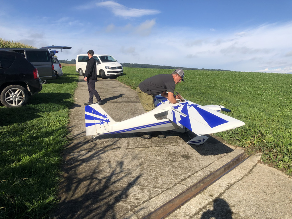 Nochmals eine Danke an unsere Kollegen die unseren Nachbarn so tolle Einblicke in unser Hobby gegeben haben. Roli absolvierte mit seiner Sukhoi 29 ein wunderschönes oldSchool Freestyle Programm, Elmer zeigte uns das man mit der Bellanca auch Kunstflug fliegen kann. Ich habe nochmal nachgeschaut, nach dem Flug sass der Pornobalken des eingeklebte Pilot noch 1a .. dank Harz und Leim ist da nichts verrutscht. Hugo und Mäsi habe Ihre Segler über den Platz gescheucht während Mathias seine Jets startklar gemacht hat. Er flog mit dem Skyrunner 300 zum Erstaunen der Gäste mit über 427 km/h über den Platz und zeigte uns das man mit dem Bullseye von Fraundorfer auch schöne Landungen hinbekommt.