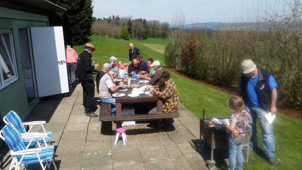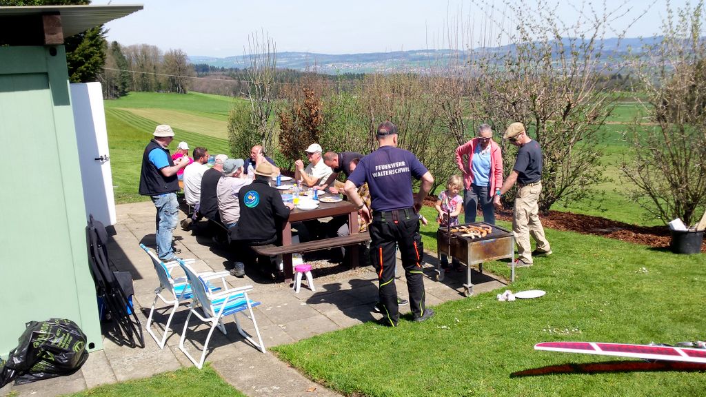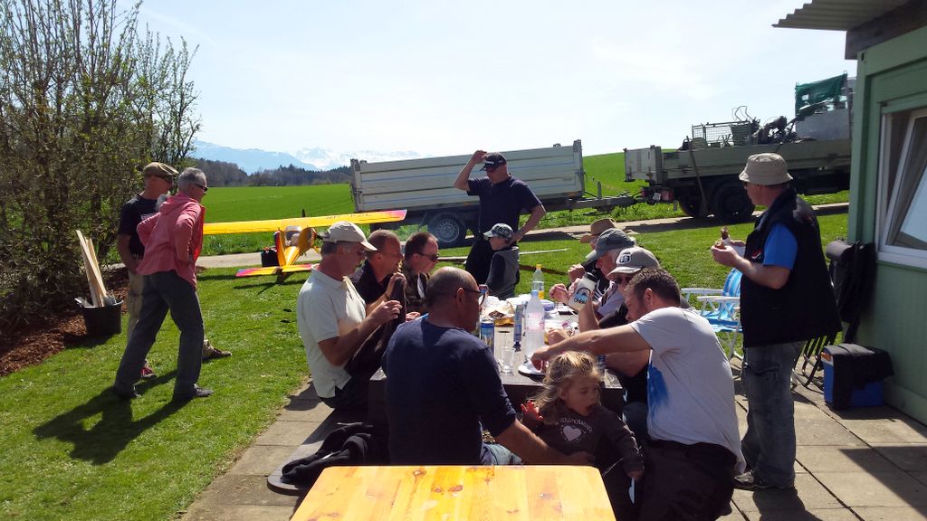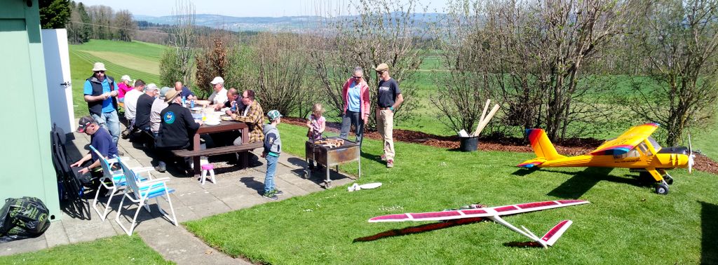 wurde mit ein paar fleissigen Helfern, der Arbeitstag vollbracht. Die Hütte wurde aufgeräumt, Holzschnitzel verteilt, Rasen vertikutiert, Feuerholz gefräst und auf den Platz gebracht… etc. später noch der Tisch und die Bänke gestrichen… HERZLICHEN DANK – AN ALLE HELFER – SEHR NETT VON EUCH !!! Anschliessend durften wir ein feines Zmitag vom Grill geniessen und am Nachmittag noch einige schöne Flüge und Schlepp’s absolvieren. Als Novum gab es am Abend zwei kleine Mirage zu bewundern; eine als Elektrojet (die Meine)… die andere mit Kerosin-Turbine (von Thomas N.) getrieben… ein absolutes Highlight im heurigen Frühling.