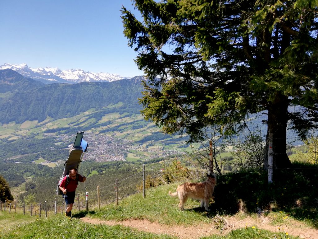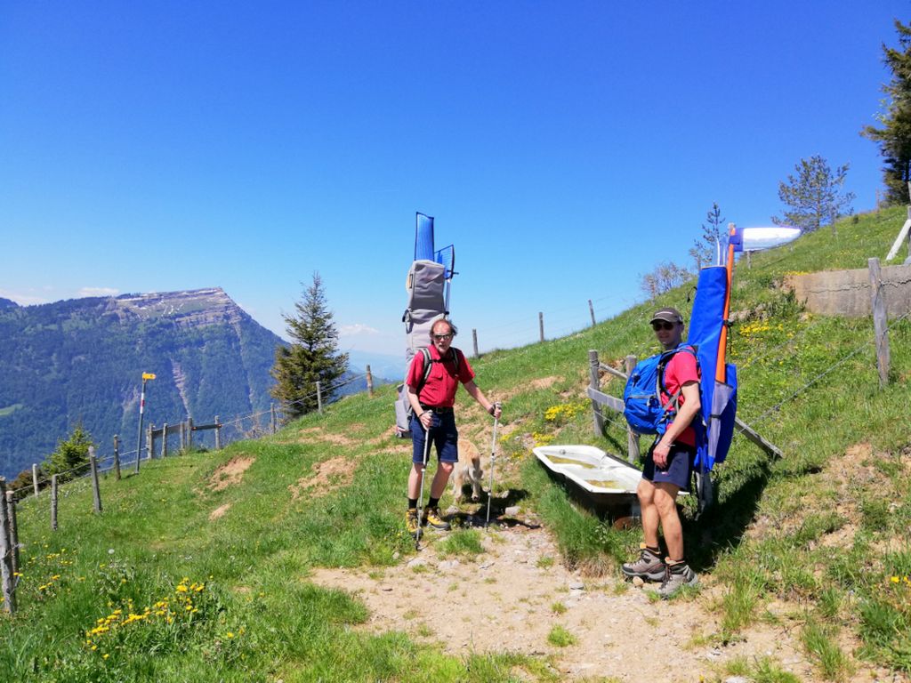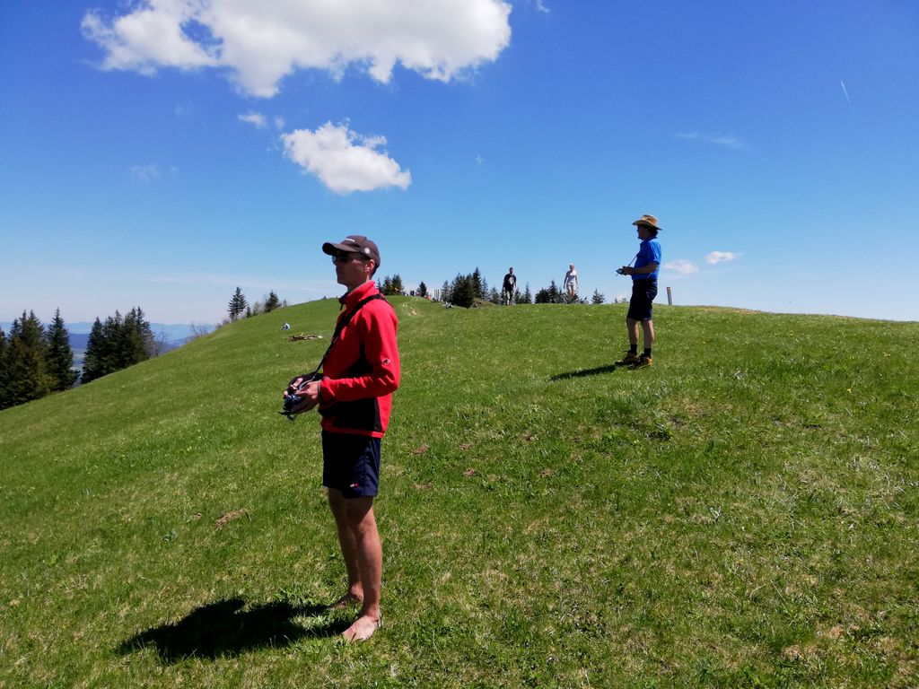Helmut war noch da, als wir (Thomas Studer mit „Aiza“, Helmi und ich) nochmals den Gnipen bestiegen und zusammen Bergluft schnupperten. Wir wanderten wiederum von der Steinerbergseite her; den kürzeren aber steileren Weg auf den Wildspitz. Die Thermik stellt sich schon bald gut ein und wir konnten ausgiebig fliegen. Auch Robi und ein weiterer Gast gesellten sich noch zu uns und wir genossen den gemeinsamen Flugtag auf dem schönsten Flughang im Voralpenland.