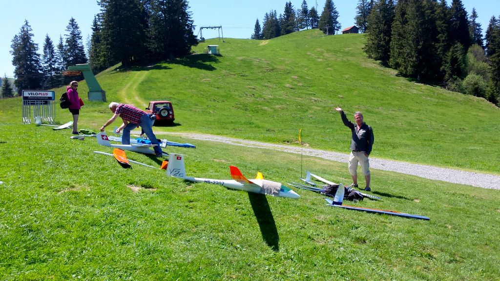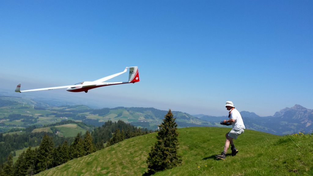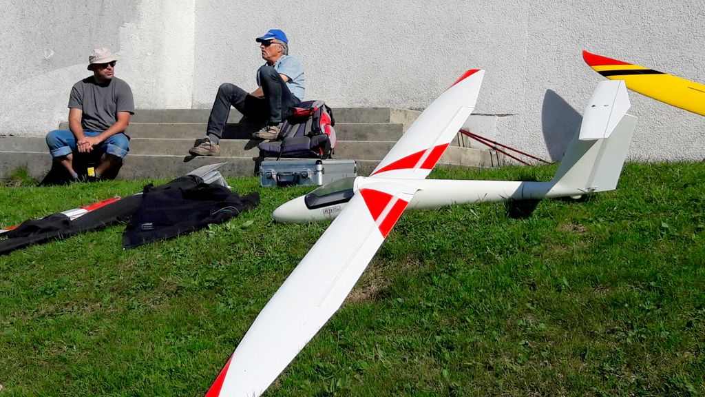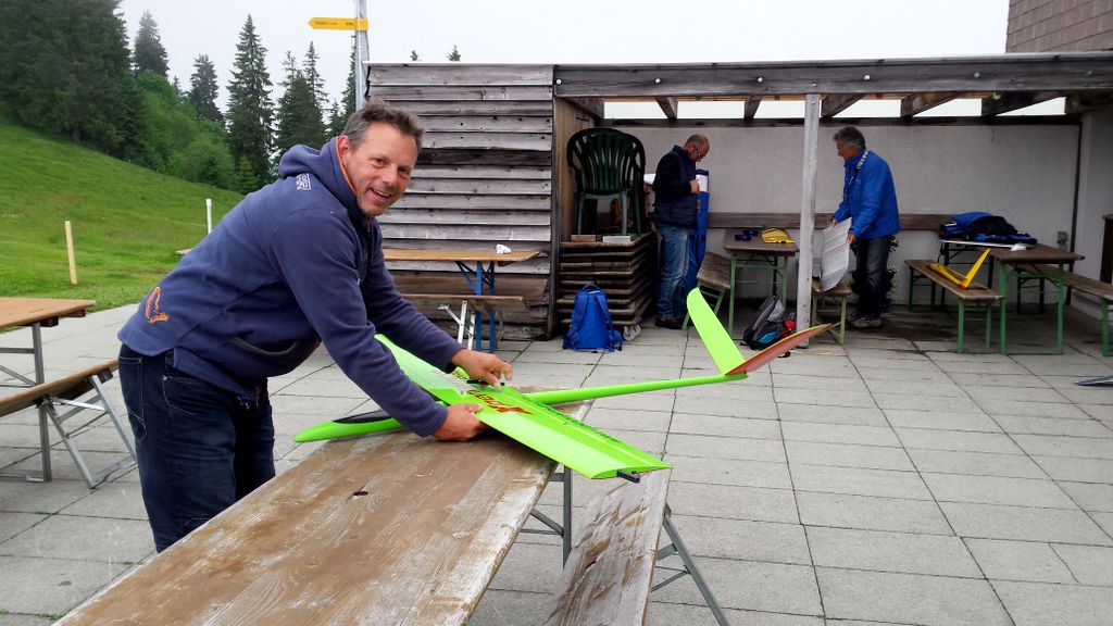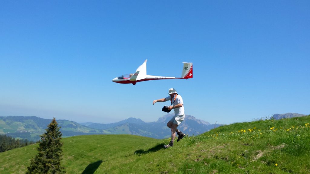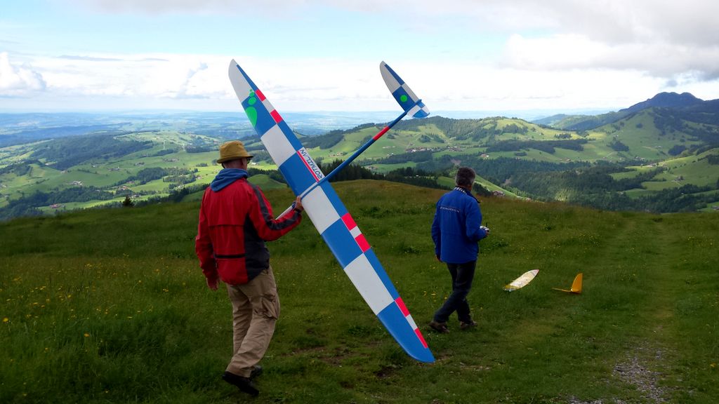 Die beiden Top-Schlepppiloten Markus und Roland zeigten keine Schwächen und zogen den ganzen Tag lang alle Segler zuverlässig auf die geforderten Ausgangshöhen. Da ich beim vorangegangenen Wettbewerb in Isenbergschwil etwas Schwierigkeiten mit der Sichtbarkeit (…unter erschwerten Bedingungen) der Arcus hatte, wurden ihr kurzerhand Blockstreifen in Leuchtfarbe auf der Unter- und Oberseite der Flächen geklebt; die Erkennbarkeit: nun einiges besser. Als Seglerpilot wurde es schwierig, wenn die Luft mal nicht so gut trug… Als Gast kannte man die Platzverhältnisse nicht so gut und wusste nicht recht, in wie weit man die schwachen Bläs’chen kurbeln sollte (versuchen..); oder doch lieber auf Strecke ging und die gegebene Höhe in maximale Distanz umzusetzen versuchte. Jedoch sollte dann nicht zuviel riskiert werden, denn eine Aussenlandung kann wertvolle Punkte kosten und das Modell zusätzlich gefährden -Spitzenplätze ade, mit Sicherheit.