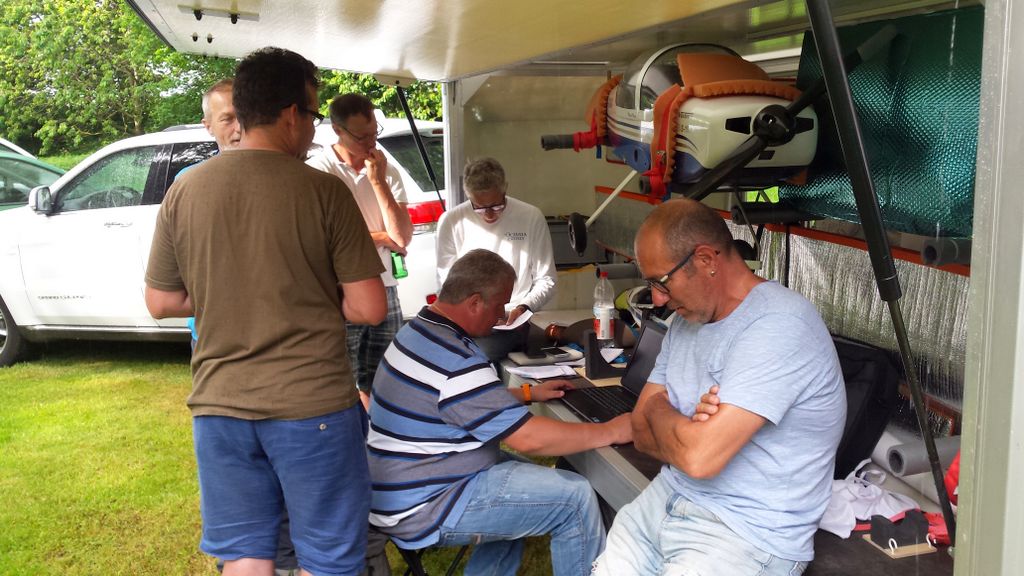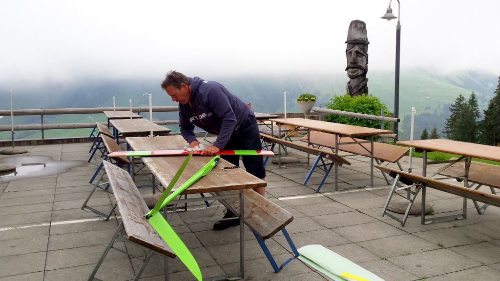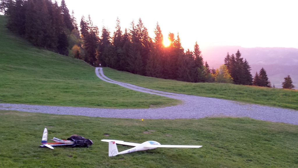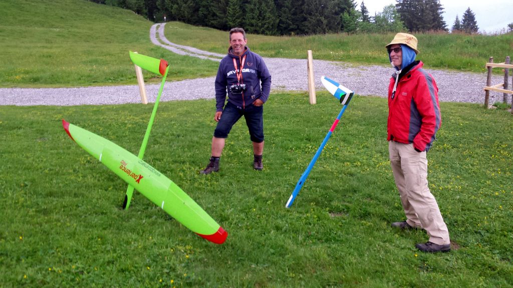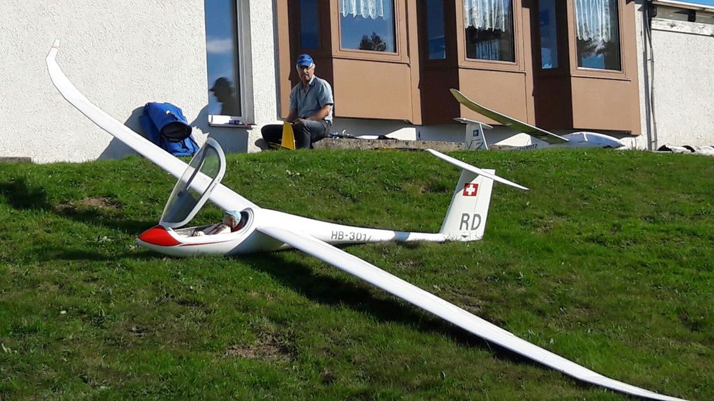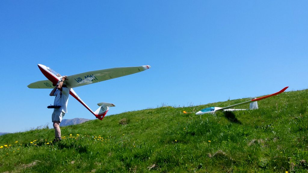 Die beiden Top-Schlepppiloten Markus und Roland zeigten keine Schwächen und zogen den ganzen Tag lang alle Segler zuverlässig auf die geforderten Ausgangshöhen. Da ich beim vorangegangenen Wettbewerb in Isenbergschwil etwas Schwierigkeiten mit der Sichtbarkeit (…unter erschwerten Bedingungen) der Arcus hatte, wurden ihr kurzerhand Blockstreifen in Leuchtfarbe auf der Unter- und Oberseite der Flächen geklebt; die Erkennbarkeit: nun einiges besser. Als Seglerpilot wurde es schwierig, wenn die Luft mal nicht so gut trug… Als Gast kannte man die Platzverhältnisse nicht so gut und wusste nicht recht, in wie weit man die schwachen Bläs’chen kurbeln sollte (versuchen..); oder doch lieber auf Strecke ging und die gegebene Höhe in maximale Distanz umzusetzen versuchte. Jedoch sollte dann nicht zuviel riskiert werden, denn eine Aussenlandung kann wertvolle Punkte kosten und das Modell zusätzlich gefährden -Spitzenplätze ade, mit Sicherheit.