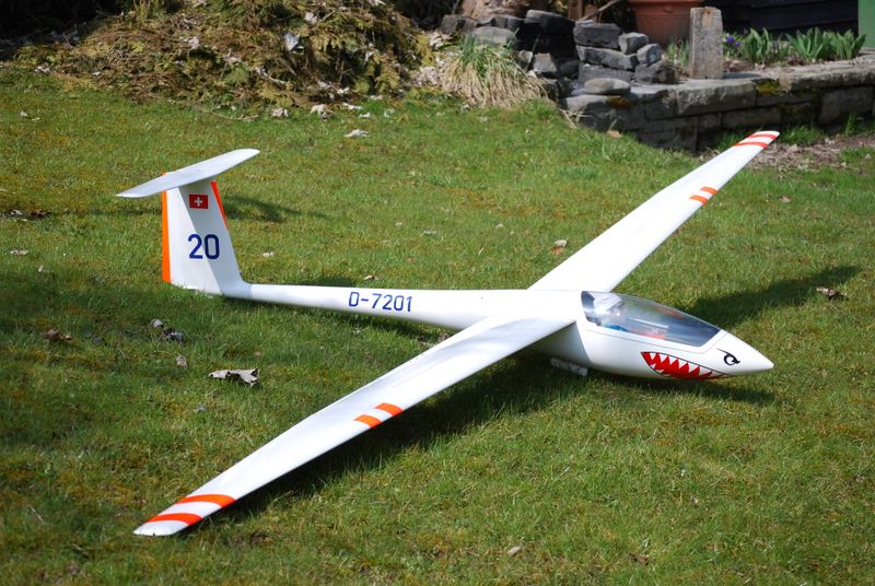 Als ich das Modell startbereit aufgebaut und die Funktionen nochmals geprüft hatte, schob ich es mit gutem Anlauf (8.8kg bei 4.8m Spanweite) ins luftige Element, was auch perfekt klappte. Die Wölbklappen ca. 2mm auf tief gestellt, flog die ASW auf Anhieb. Also erstmal etwas Höhe tanken und den Segler mit der ganzen Erfahrung – Probe- und Einfliegen. Sie hat einen satten Durchzug und reagiert extrem gut auf die Thermik- und Speedeinstellungen der Flächenklappen. Bei einer guten Sicherheitshöhe angekommen testete ich die Stalleigenschaften; um es vorneweg zu nehmen, ich konnte keinen Stall erzwingen, selbst mit voll gezogenem HR nicht… ich war begeistert. Diese ASW ist quasi die Erweiterung der Valenta-ASW mit all diesen Steigerungsformen; grösser, leistungsfähiger, gutmütiger, besser zu sehen, usw… Das Shark-Design, finde ich, eine willkommene Abwechslung am Seglerhimmel ;-]
