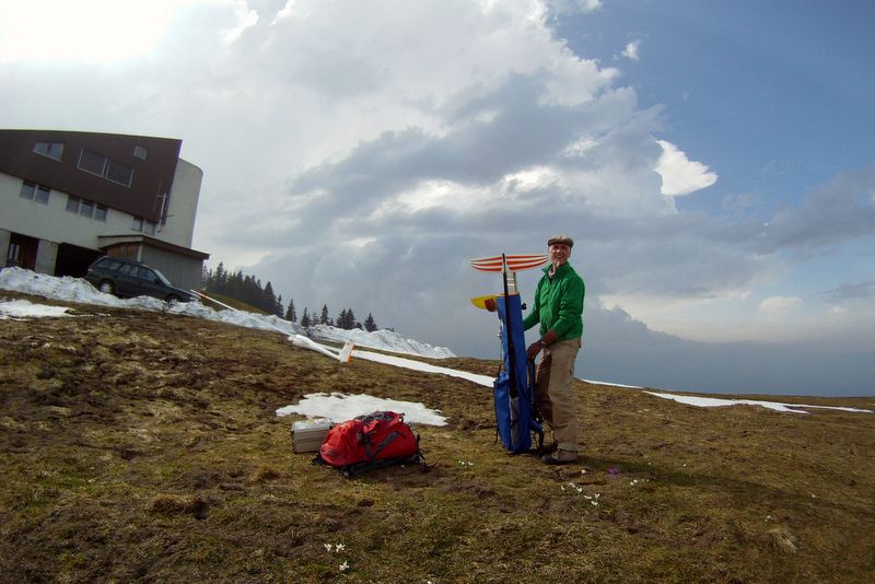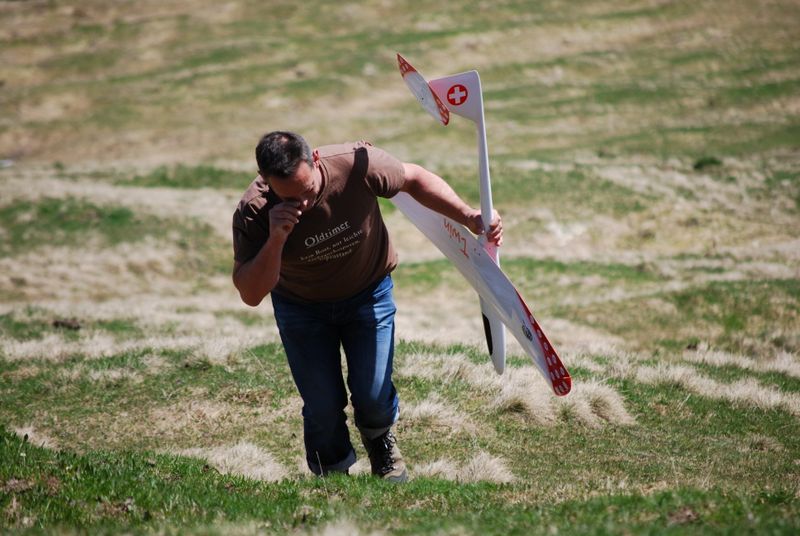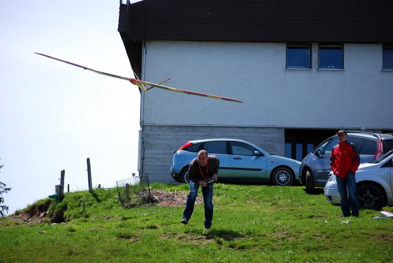 Oben angelangt blies der Wind nicht aus der zu erwartenden Richtung, sondern aus Süd-Westen. Nun denn, es war ja trotzdem schönes Wetter und da sollte es ja auch Thermik geben, auch Richtung Parkplatz hinunter… Also Flieger aufgebaut und auf die ‚falsche‘ Seite rausgestartet. Was folgte war Rodeo-Fliegen par excellence ;-]