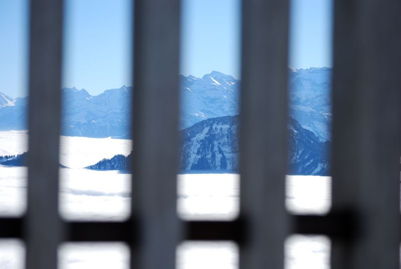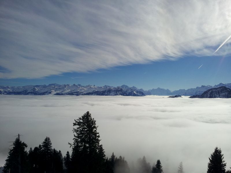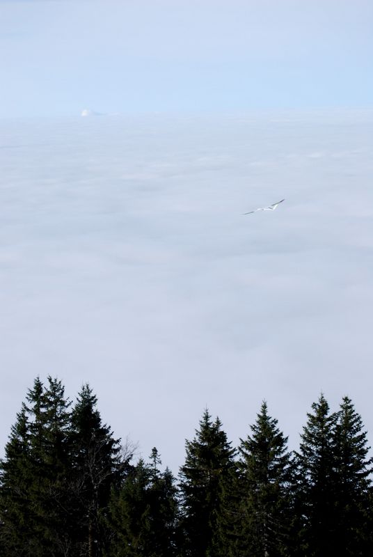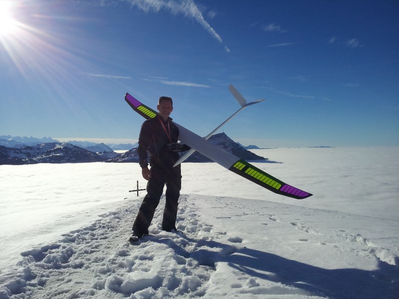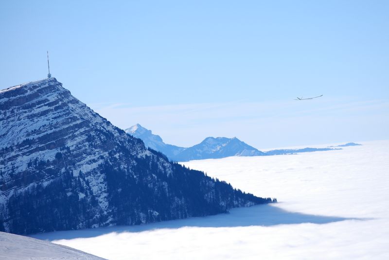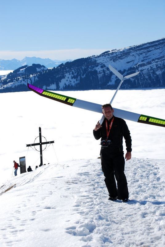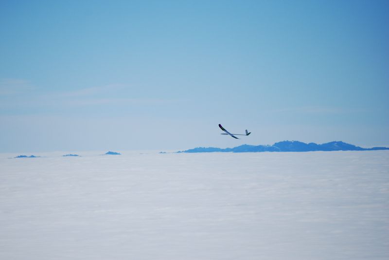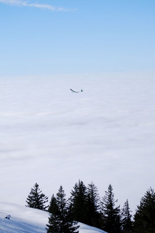 Im Rucksack den neuen F3J-Leichtwindsegler, eine Kanne Tee, Wasser, Servelat’s mit Brot und Senf… und natürlich Klamotten zum Wechseln. Kurz nach dem Abmarsch äugte schon die Sonne durch die Trübe Suppe und kurze Zeit später standen wir im strahlend Sonnenschein und einem Weltklasse-Panorama gegenüber – unten das riesige Nebelmeer. Man konnte bis in den Jura/Chasseral und den Schwarzwald sehen; auch der Napf, Pilatus, Mönch, Eiger, den Tödi im Glarnerland etc.