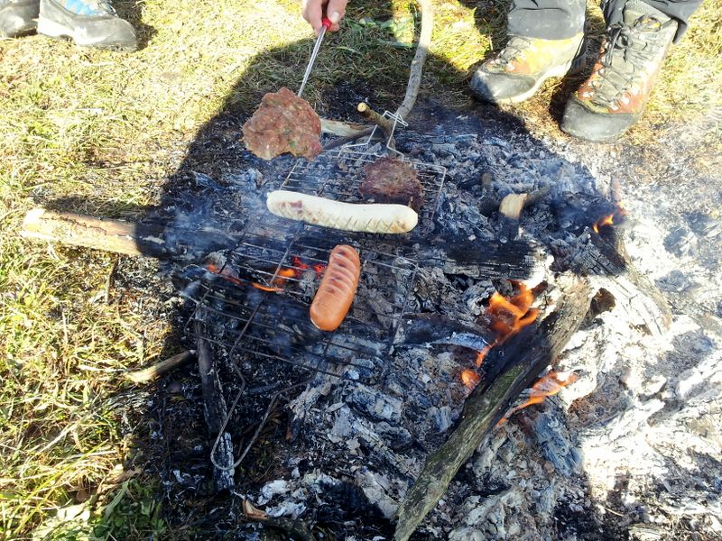 Drei gutgelaunte Wandersleute hatten einiges an Holz mit dabei und entfachten ein perfektes Grillfeuer, auf dem Hamburger (mit allem drum und dran) und Würste gebrötelt wurden. Was ein Zufall, dass ich ebenfalls Servelat’s mit dabei hatte; sie luden uns herzlich ein, unsere Würste auf ihrem Feuer mit zu grillen.