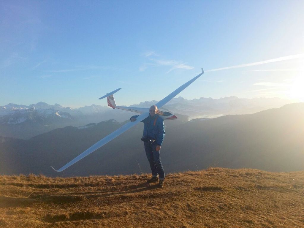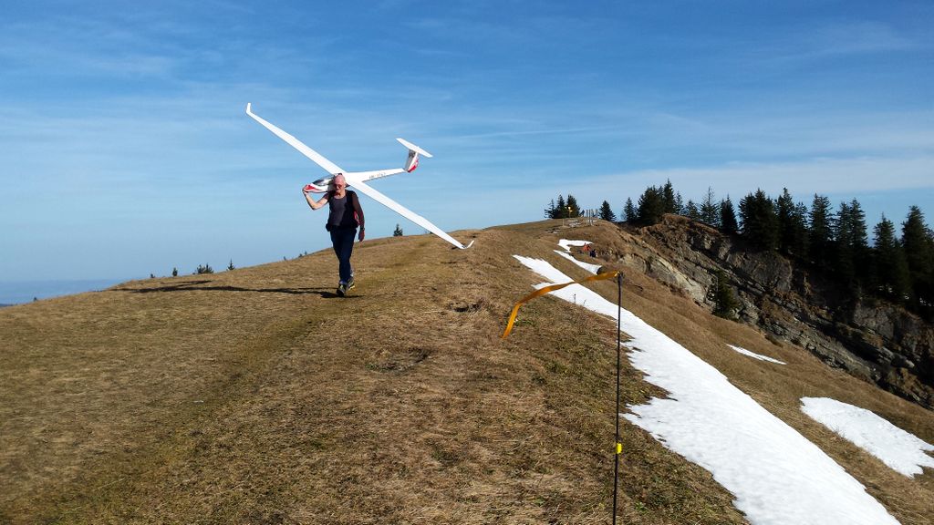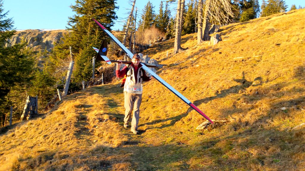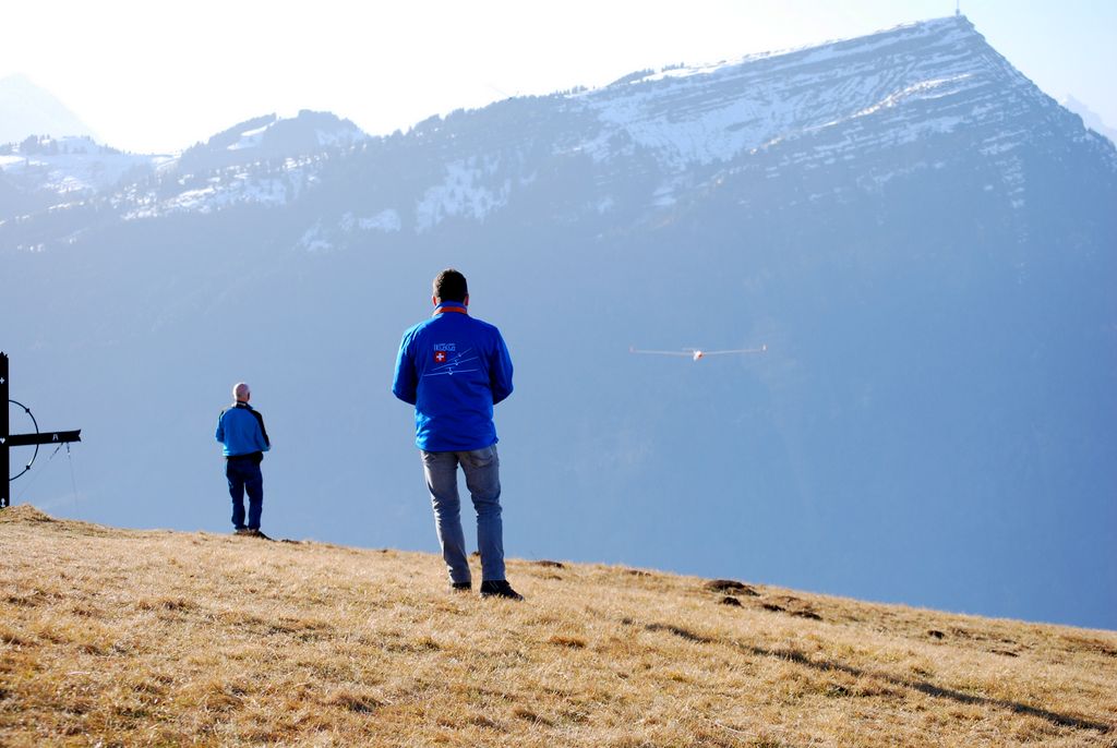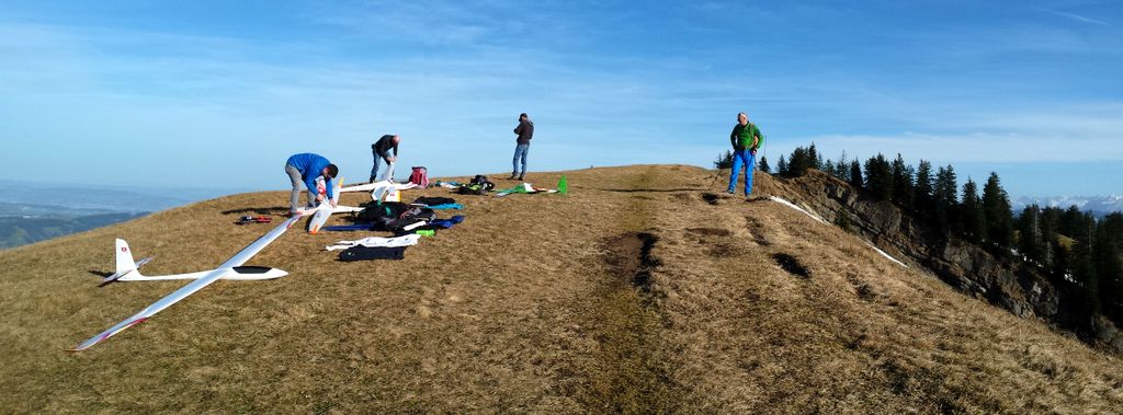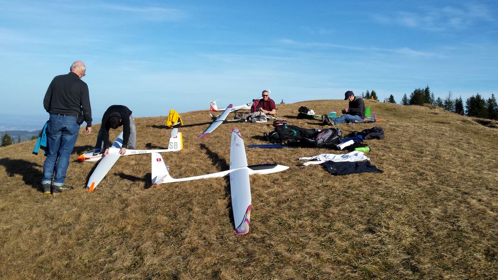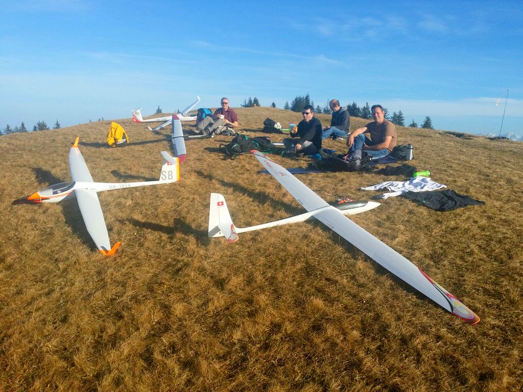Ohne Akkus nachladen zu müssen (Lipo sei Dank!), packte ich die Alpina in den Rucksack und war bereit für einen letzten Gang auf den Gnipen im 2015. Zu fünft hatten wir beim Parkplatz bei der Kapelle abgemacht um den Marsch anzugehen; bei deutlichen +Graden verschwanden die warmen Jacken schnell wieder im Rucksack. Hier über dem Nebel herrschte wunderbares und sonniges ‚Winterwetter‘ mit einer genialen Aussicht. Der Südwind blies etwas schwach, aber spürbar und liess uns für gutes Fliegen hoffen. Schnell waren die Modelle zusammengestellt und auch schon über den Abbruch dem Element übergeben. Im knappen Aufwind hiess es, immer schön der Kante entlang fliegen; wurde eine gewisse Höhe, unter Putz, unterschritten, war klar; vorne um den Hang fliegen (wo meist nochmals etwas Thermik vorhanden war..) und von der Nordseite her die Wiese hinauf landen. Leider liess der Wind im Laufe der Zeit deutlich nach und auch die sehnlichst erwartete Thermik war sehr schwach. Dennoch genossen wir dieses Traumwetter mit einem feinen Vesper aus dem Rucksack.