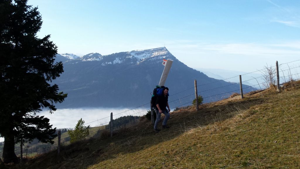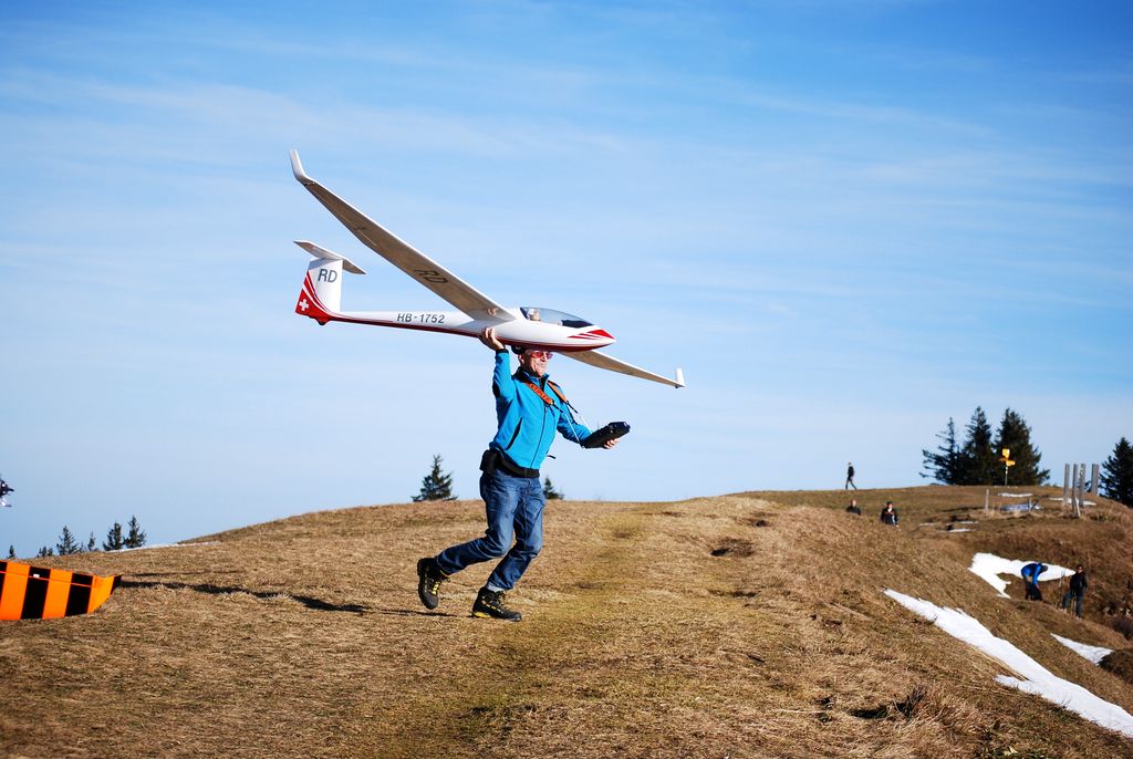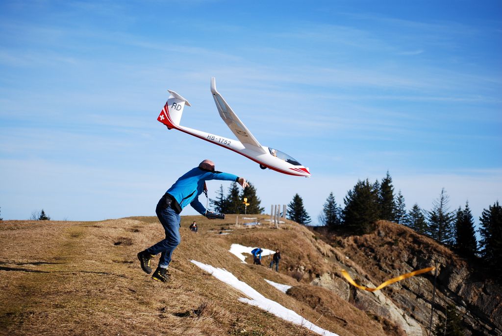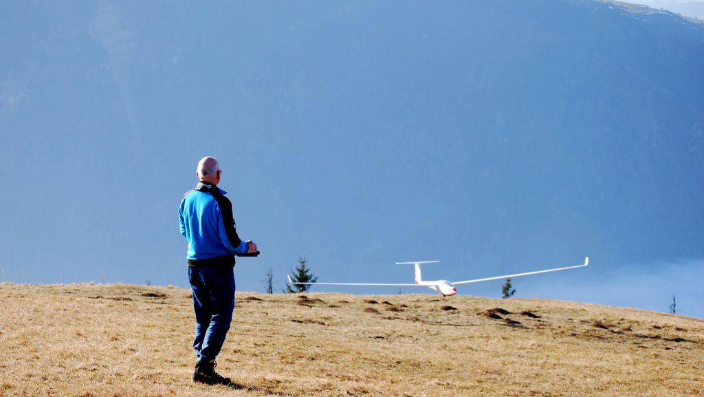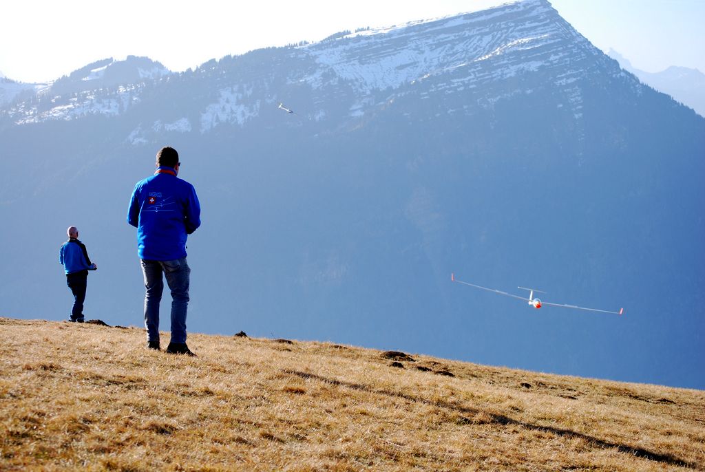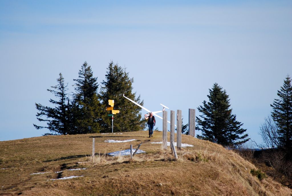 Ohne Akkus nachladen zu müssen (Lipo sei Dank!), packte ich die Alpina in den Rucksack und war bereit für einen letzten Gang auf den Gnipen im 2015. Zu fünft hatten wir beim Parkplatz bei der Kapelle abgemacht um den Marsch anzugehen; bei deutlichen +Graden verschwanden die warmen Jacken schnell wieder im Rucksack. Hier über dem Nebel herrschte wunderbares und sonniges ‚Winterwetter‘ mit einer genialen Aussicht. Der Südwind blies etwas schwach, aber spürbar und liess uns für gutes Fliegen hoffen. Schnell waren die Modelle zusammengestellt und auch schon über den Abbruch dem Element übergeben. Im knappen Aufwind hiess es, immer schön der Kante entlang fliegen; wurde eine gewisse Höhe, unter Putz, unterschritten, war klar; vorne um den Hang fliegen (wo meist nochmals etwas Thermik vorhanden war..) und von der Nordseite her die Wiese hinauf landen. Leider liess der Wind im Laufe der Zeit deutlich nach und auch die sehnlichst erwartete Thermik war sehr schwach. Dennoch genossen wir dieses Traumwetter mit einem feinen Vesper aus dem Rucksack.