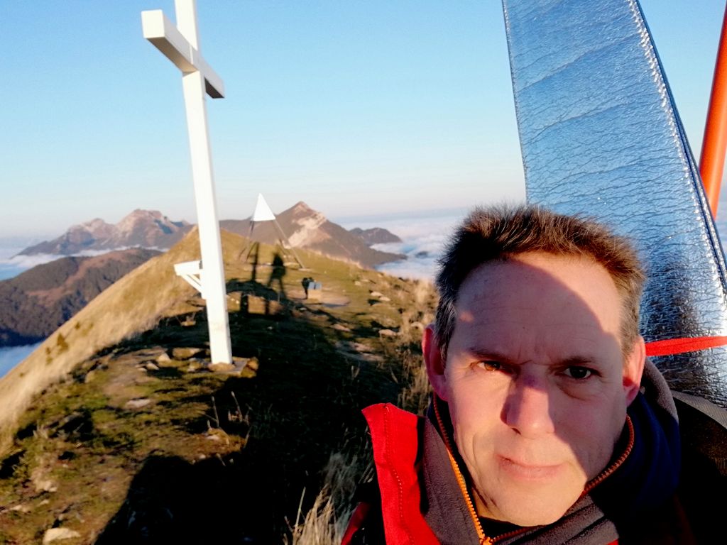 Andy A. wollte unbedingt einmal den Südföhn auf dem Gnipen erleben; also verabredeten wir uns recht spontan am 15. November beim Tierpark Goldau zum gemeinsamen Ausflug auf den Gnipen. Der Aufstieg war für die beiden Gäste ‚unerwartet‘ steil und dadurch relativ anstrengend. Das Flug- und Aussichtserlebnis belohnte jedoch die Mühen und Begeisterung kam auf.