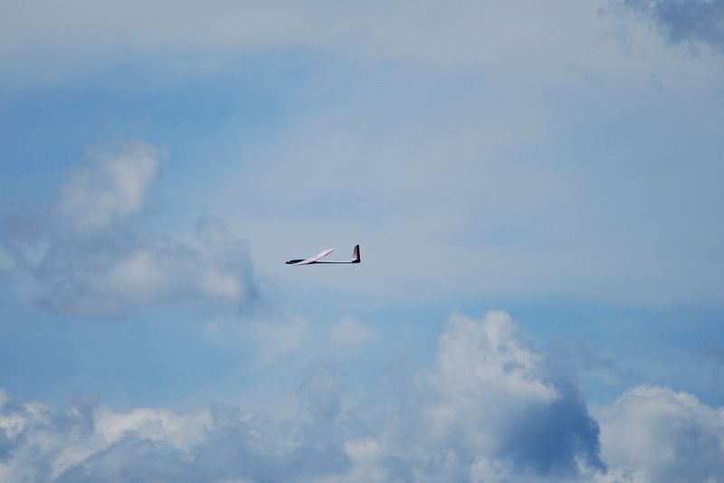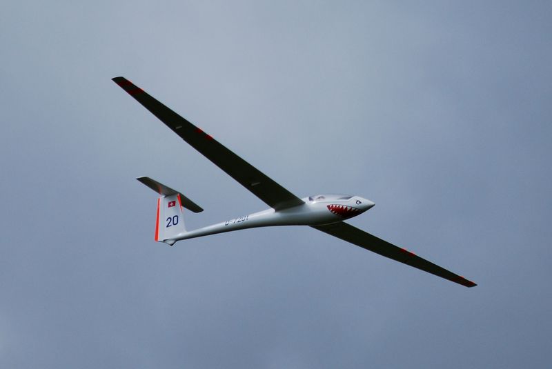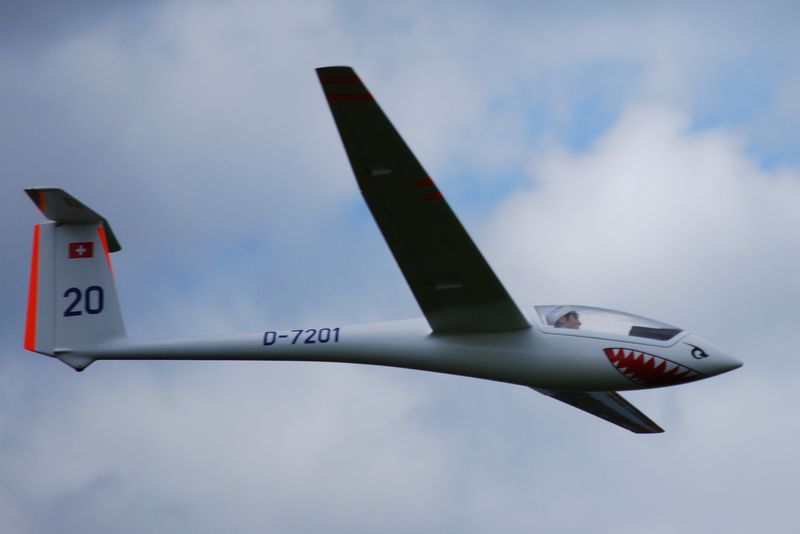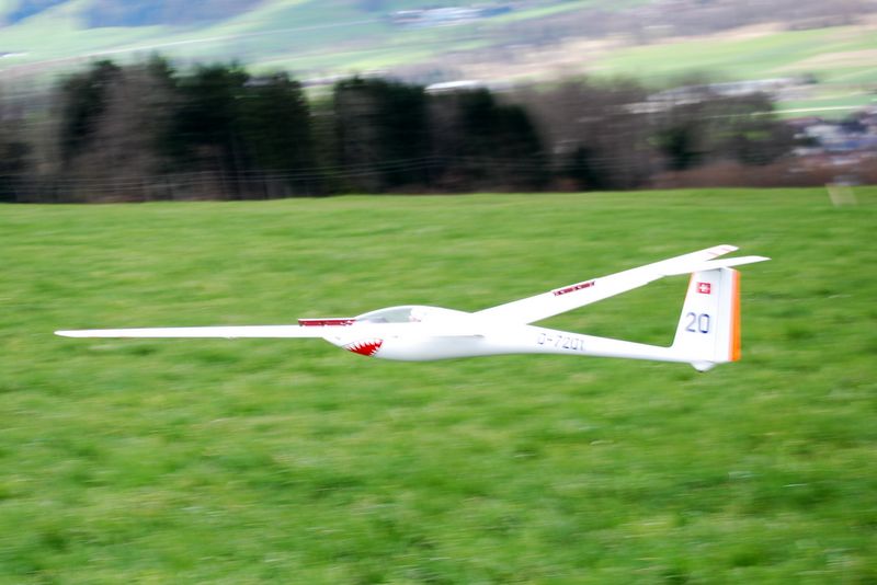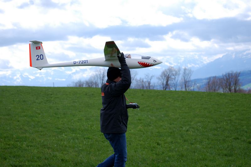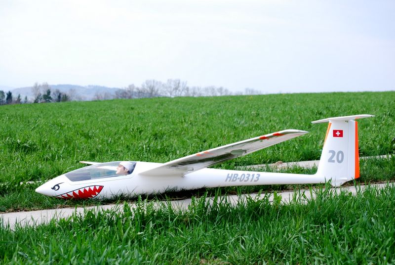 Als ich das Modell startbereit aufgebaut und die Funktionen nochmals geprüft hatte, schob ich es mit gutem Anlauf (8.8kg bei 4.8m Spanweite) ins luftige Element, was auch perfekt klappte. Die Wölbklappen ca. 2mm auf tief gestellt, flog die ASW auf Anhieb. Also erstmal etwas Höhe tanken und den Segler mit der ganzen Erfahrung – Probe- und Einfliegen. Sie hat einen satten Durchzug und reagiert extrem gut auf die Thermik- und Speedeinstellungen der Flächenklappen. Bei einer guten Sicherheitshöhe angekommen testete ich die Stalleigenschaften; um es vorneweg zu nehmen, ich konnte keinen Stall erzwingen, selbst mit voll gezogenem HR nicht… ich war begeistert. Diese ASW ist quasi die Erweiterung der Valenta-ASW mit all diesen Steigerungsformen; grösser, leistungsfähiger, gutmütiger, besser zu sehen, usw… Das Shark-Design, finde ich, eine willkommene Abwechslung am Seglerhimmel ;-]