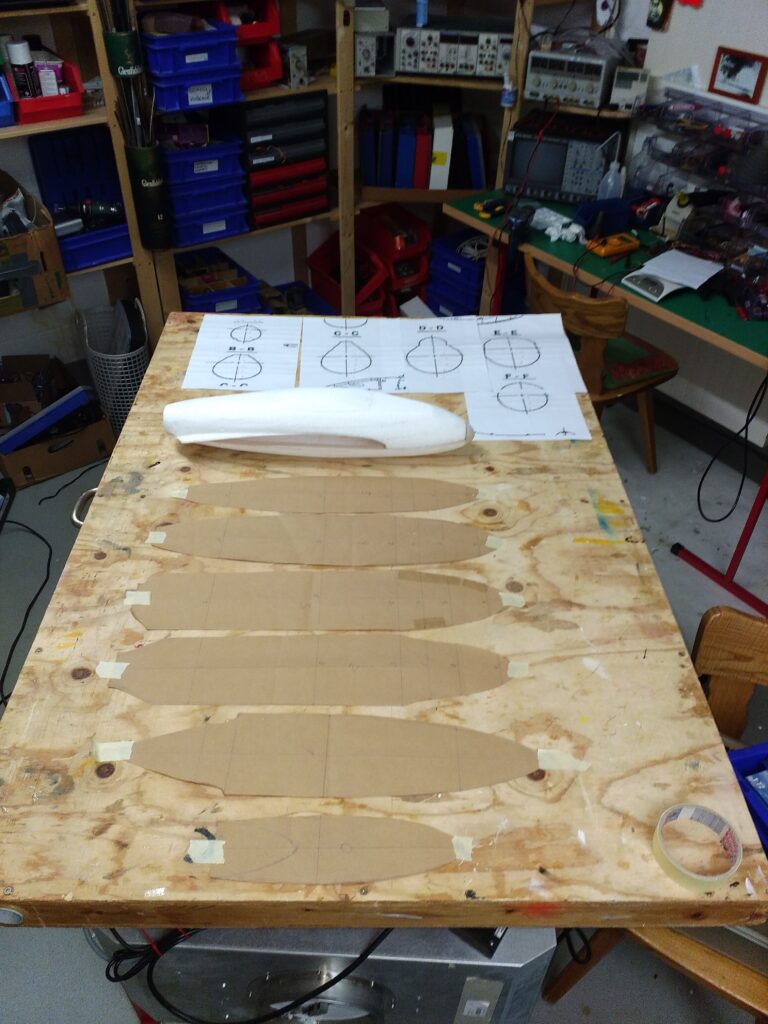 Mit dem Rumpf habe ich dann auch gleich angefangen. Gefertigt aus 20mm Styropor Schichten in Profil-Relief-Bauweise: