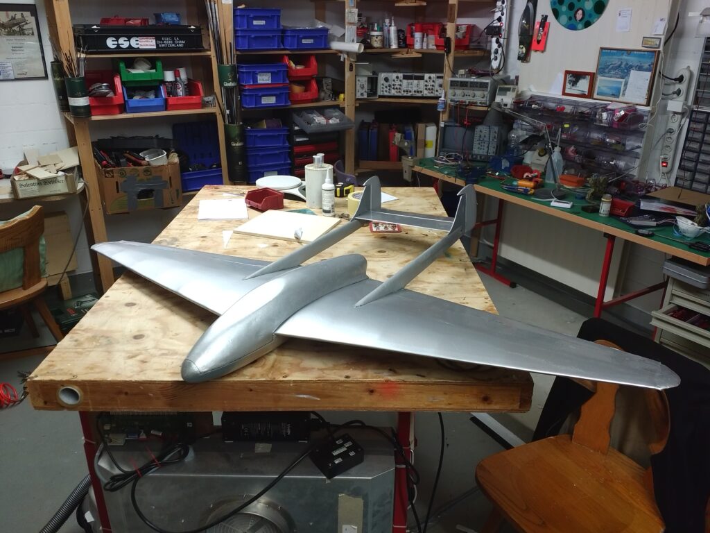 Einen RC-Vampire DH100 mit Raketenantrieb hatte ich einst im Mai schon mal gebaut. Der hatte auch ganz leidliche Segelflugeigenschaften trotz ziemlich hoher Flächenbelastung, obwohl er dann letztlich leider zum Explodieren neigte.