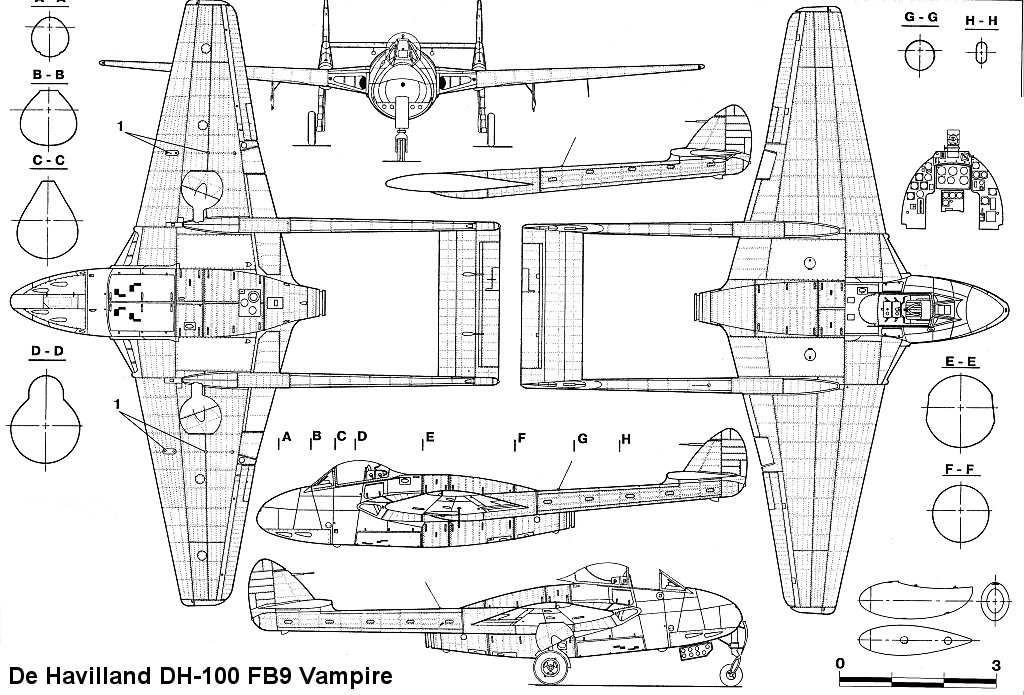 Ein recht detailierter DH100 Fünfseitenriss mit Rumpfquerschnitten befand sich schon seit Jahren auf meinem Computer, weil ich mich seit jeher zu de Havilland Designs hingezogen fühlte.