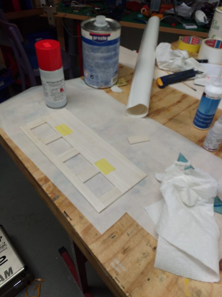 Depron-Rippenbauweise. Platten aus 3mm Depron (Extrudiertes Polystyrol) werden dabei auf der Aussenseite zuerst mit Orastick-Folie beklebt.