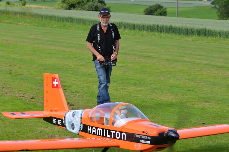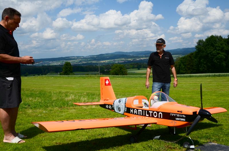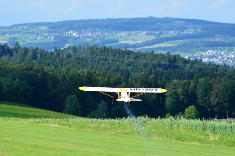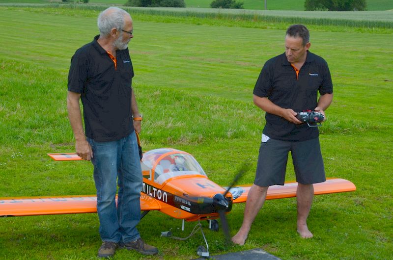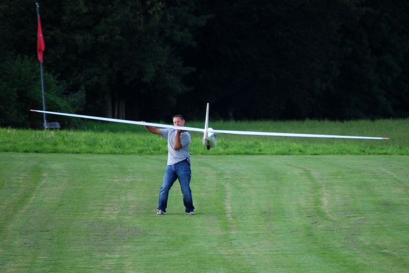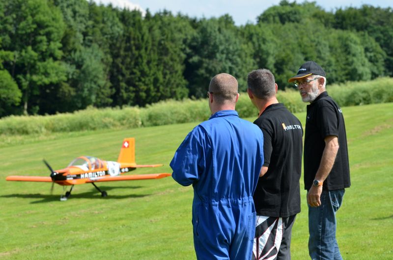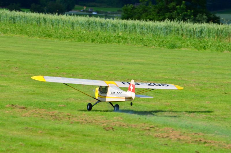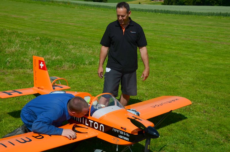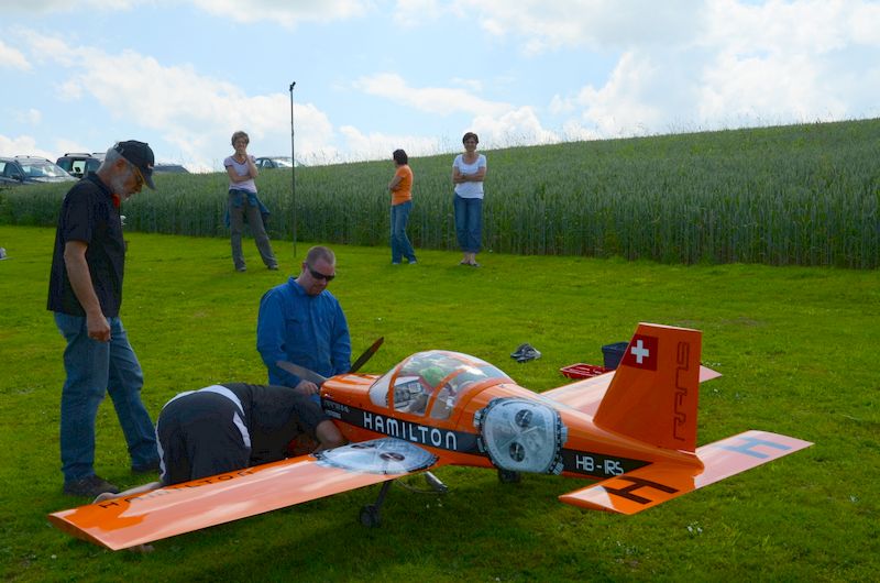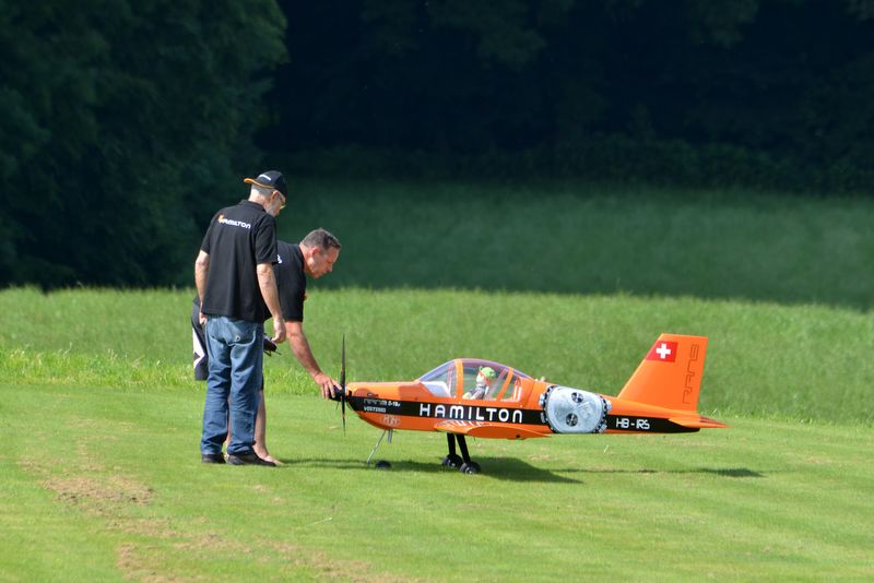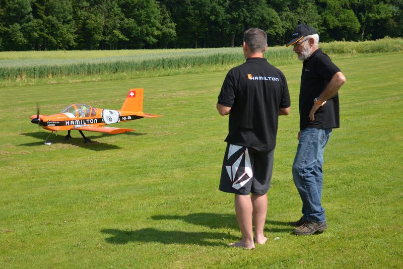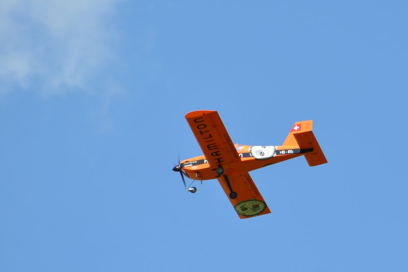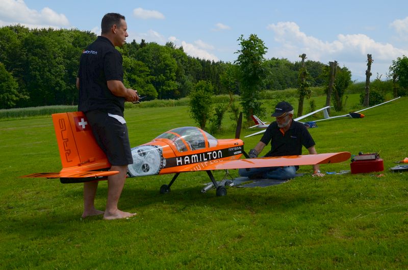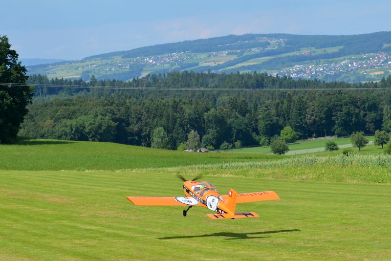 Und schliesslich ging es schon ans Werk; Ruderdirektion gecheckt, Motor an, ein guter Schubs… und bereits flog die Schöne gen Himmel. Es musste wenig getrimmt werden und die Alpina machte ihrem Namen alle Ehre! Sie flog ‚wie am ersten Tag’… und wollte trotz der mässigen Thermik fast nicht mehr runter. Der Pilot und die Zuschauer… nur noch begeistert. Sooo soll es sein, so macht’s Spass!