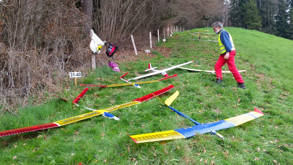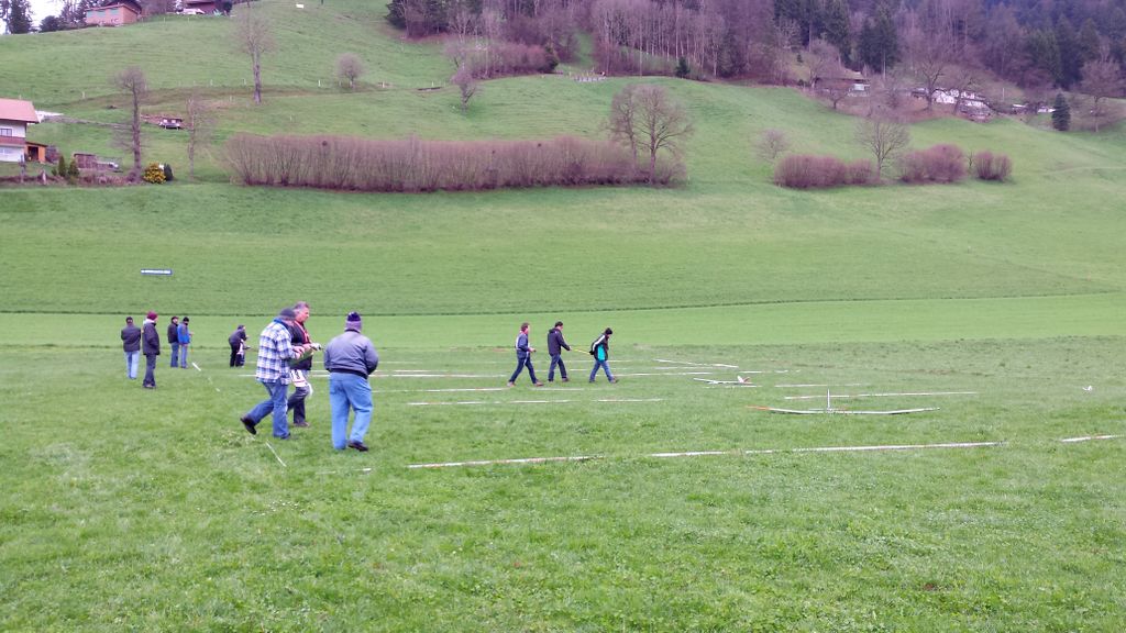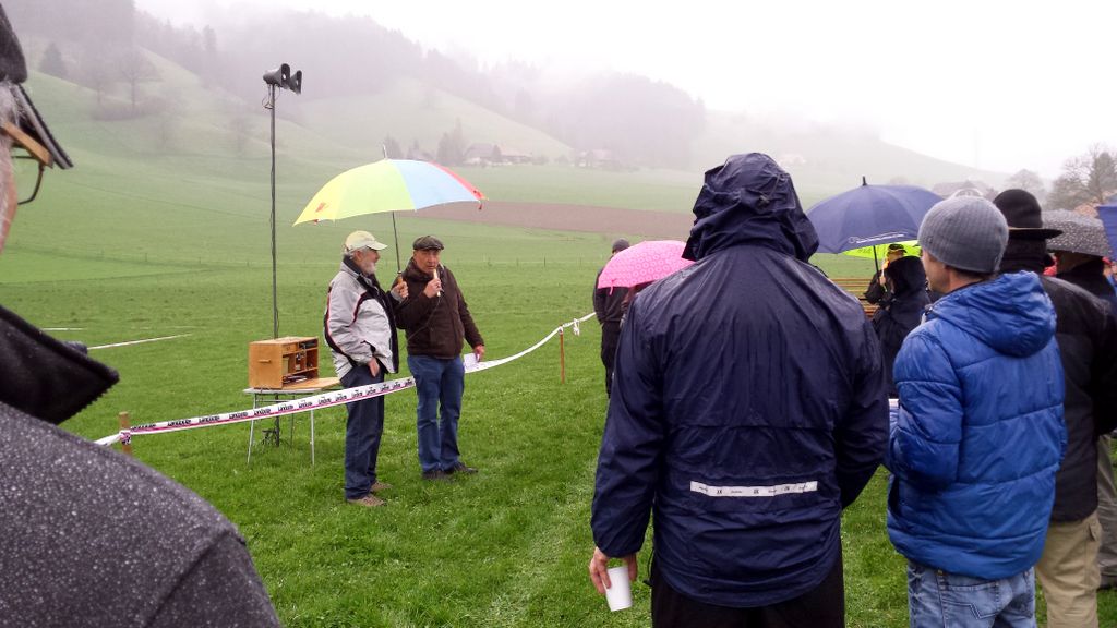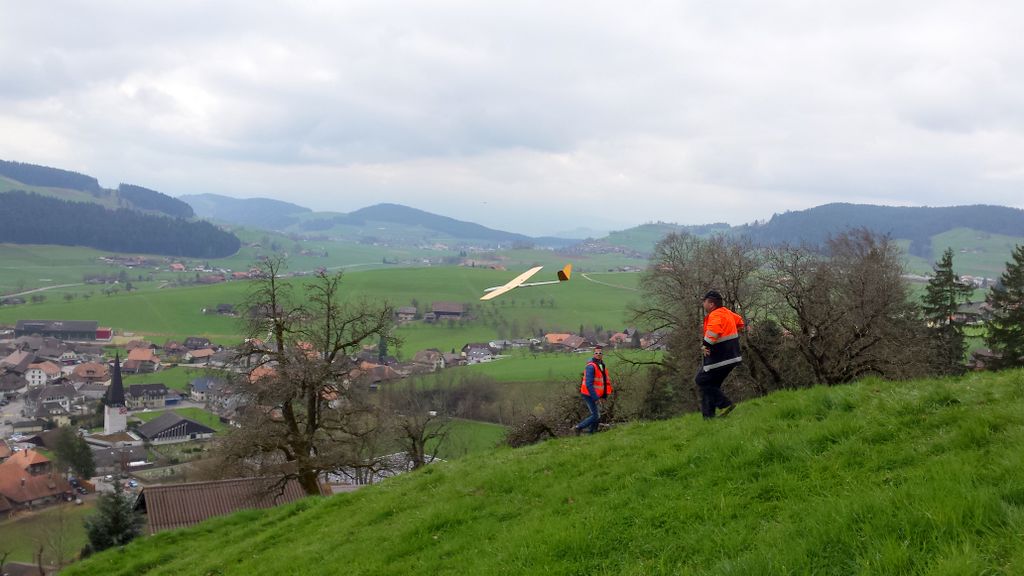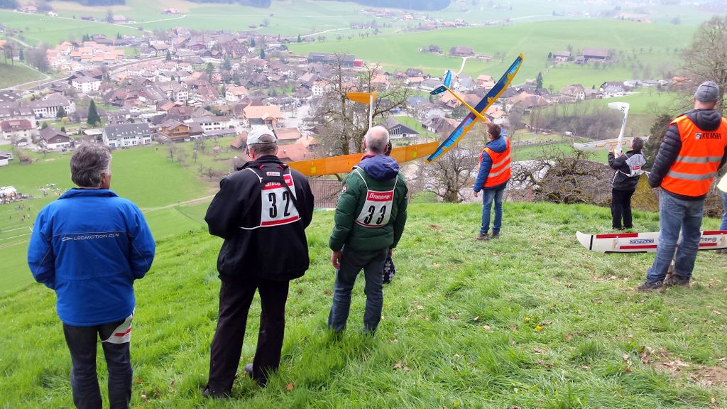 Die vorhergesagten Wetterprognosen trafen punktgenau ein. Auf der ganzen Anfahrt waren die Strassen trocken; doch genau – kurz vor Zäziwil, fing es zu nieseln an… na suuper. Somit wurde der Start zum ersten Mal etwas vertagt. Kurz nach 10Uhr wurde es zusehends heller sowie trockener (von oben) und dem Beginn des Wettbewerbes stand nichts mehr im Wege. Einigen Piloten war es aber dennoch zu nass und verzichteten auf die Teilnahme; solche Entscheidungen sind schwierig zu fällen, jedoch absolut verständlich. Die Bedingungen zu Beginn der ersten Flüge waren überaus abwechslungsreich, wie letztes Jahr. Konnte eine Dreiergruppe problemlos die geforderten 3Minuten abfliegen, gelang es der nächsten Gruppe bereits nicht mehr… Auch war die Wahl der Flugrichtung entscheidend, der Wind drehte den ganzen Tag durch öfters die Seite und war unten am Hang meist anders als oben am Start.